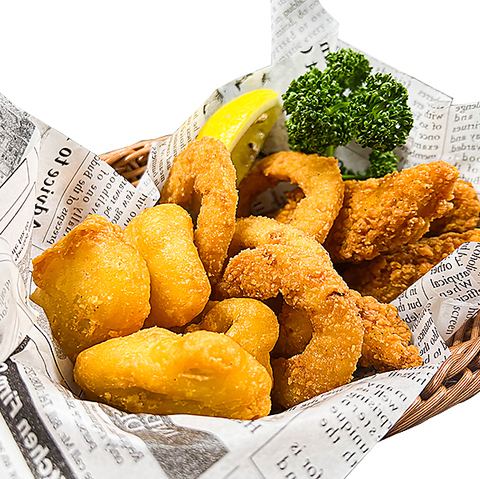 フィッシュフライ、オニオンリング、クリスピーチンの入ったプレート
