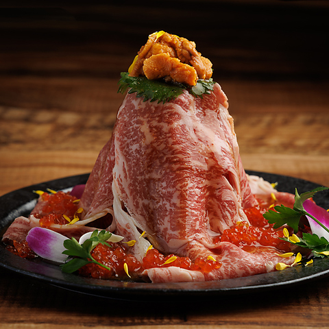 和牛ロースを贅沢に重ねた当店名物の『和牛ロースタワー ~いくら雲丹ソース~』!上に濃厚な雲丹をのせ、特製の雲丹ソースで仕上げ、周囲にいくらを散りばめた贅沢な逸品!インパクトも抜群です!