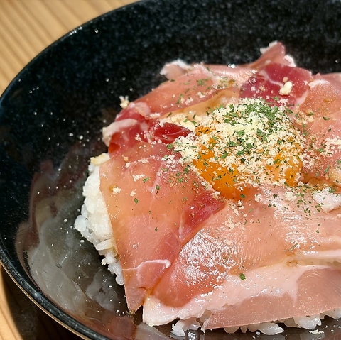 鹿児島県産黒豚生ハムを贅沢に。卵を割らずに一口。卵と絡めて一口。生ハムの香りをお愉しみいただきたい。