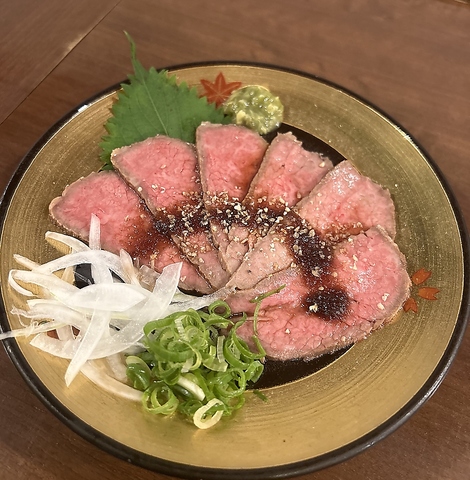 当店の人気メニュー「ローストビーフ」は、A5ランクの黒毛和牛を贅沢に使用した自慢の一品です。じっくりと低温で火入れし、肉の旨みを閉じ込めたしっとり柔らかな食感が特徴です。口の中で広がる濃厚な風味は、まさに至福のひととき。※仕入れ状況によりご提供できない場合もございます。