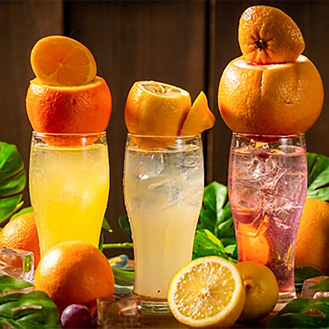 見た目のインパクト抜群!専用ジューサー「カジュッタ」で、果物の皮をそのままに、中身だけを贅沢に搾り上げました。果実に直接サワーを入れるその姿は、まさに天然のジューススタンド。「本当に100%?」と疑うほどのフレッシュさと濃厚な香りを、ぜひカメラに収めてからお楽しみください!