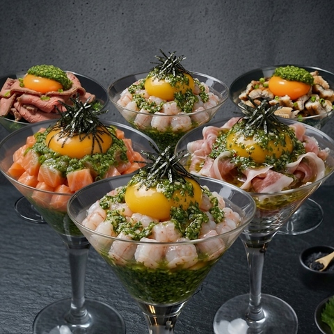 寿司・創作料理・チーズ・洋食まで楽しめる全品食べ放題プランもあります。見た目も華やかなメニューが揃い、名駅での女子会・誕生日・記念日利用にも人気です真空低温調理のお箸でほぐせる「ヘルシー鶏ももカオマンガイ」も食べ放題♪