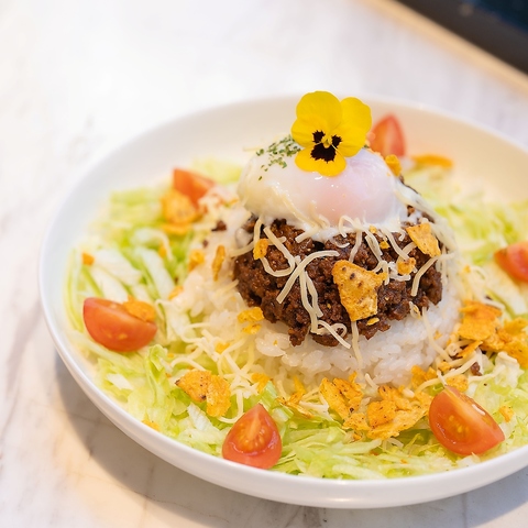 野菜たっぷりの甘辛タコライス、ピリッと辛さもありますがとろーり温玉が優しい味にしてくれます。