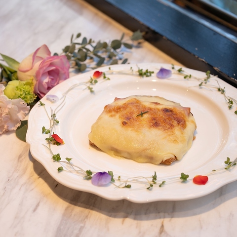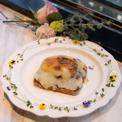ライ麦パンを使用した体に優しいオープンサンドです。ハムとこんがり焼けたチーズが美味しいです。