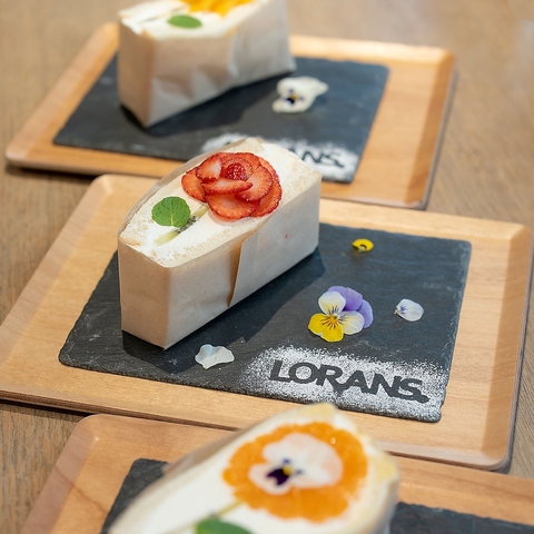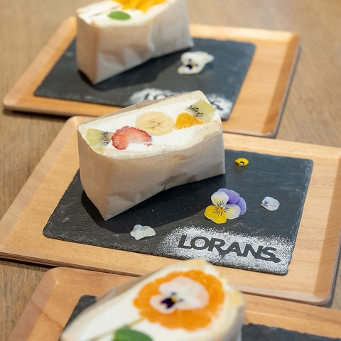 季節に合わせたフルーツサンド。その日によって使用しているフルーツやデザインが異なった特別なフルーツサンドです。カフェ店内でお召し上がりの際は、フルーツに合わせたとっておきのお皿でお出しします。