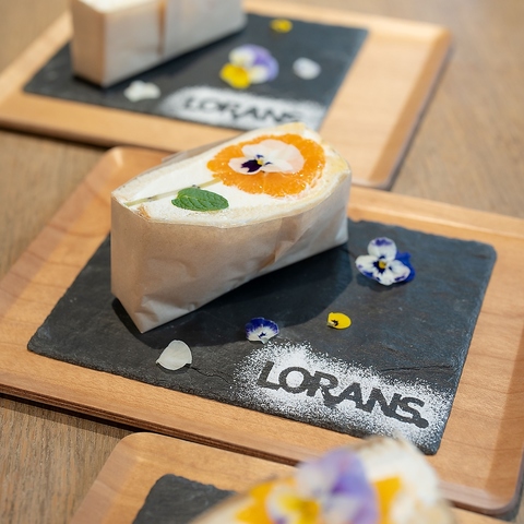 みかんを使ってお花の形にアレンジした可愛らしいフルーツサンドです。カフェ店内でお召し上がりの際は、フルーツに合わせたとっておきのお皿でお出しします。