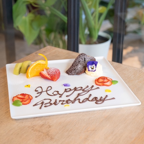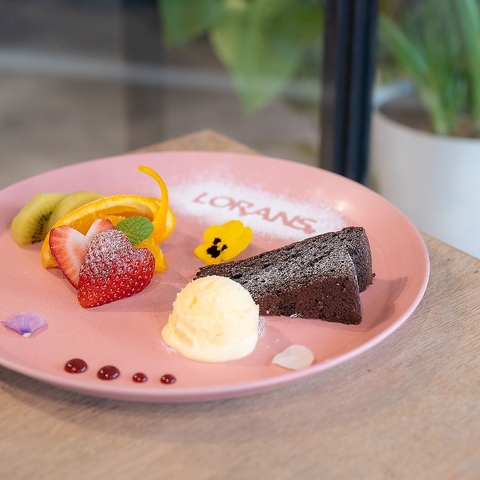 フルーツとアイスの付いたガトーショコラのケーキプレートです。プレートに合わせた特別なお皿でお出しします。