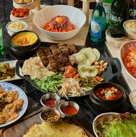 藁の香りをまとわせたサムギョプサルを鉄板で焼き、きのこ・もやし・玉ねぎ・ニラの和え物・炒めキムチ・トルティーヤを鍋蓋の上に盛り付けてご提供します。