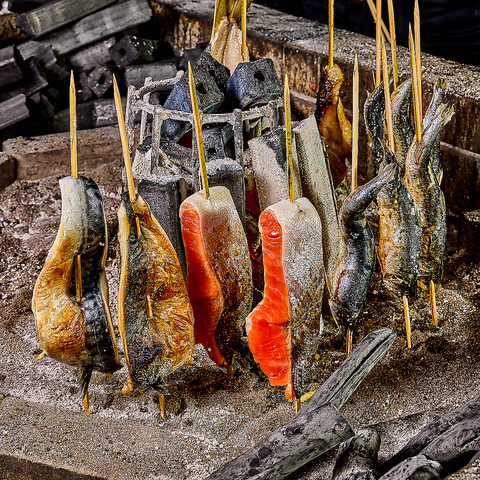 当店の代名詞「炉端焼き」。旬の魚を串に刺し、遠火の炭火でじっくり焼き上げます。表面は香ばしく、中はふっくらジューシーに。炭火の香りを楽しみながらカウンター席で焼き上がる様子を眺められるのも魅力。季節ごとに仕入れる魚介で、一期一会の味わいをどうぞ。