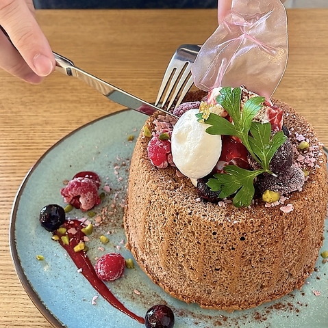 スイーツ系シフォンケーキはプレーン生地、ショコラ生地合わせて約10種類から選べますが、その中でもおすすめは『ベリーチェリー(ショコラ)』。ゴージャスな見た目になんだか気分も上々♪プレーン生地の『ベリーチェリー』(1,490円)に50円追加でショコラ生地へチェンジしたバージョンです。