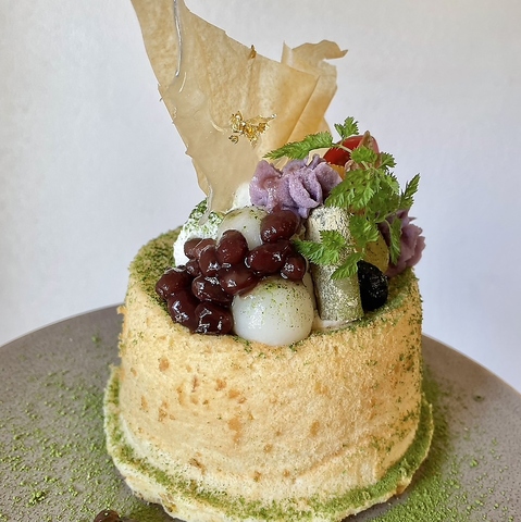 和パフェのようなこのケーキは、まるで和の美を凝縮した芸術作品です。ふわふわのスポンジ生地に、抹茶の香りが広がります。金箔のアクセントが華やかさを引き立て、目にも美しい一品。ひと口食べれば、和の風味が口いっぱいに広がり、心まで満たされる至福の瞬間を楽しめます。