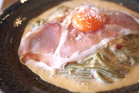 静岡産の茶葉を使用した茶そばでカリッと鴨肉どろっと濃厚なカルボナーラに イタリア産生ハムを贅沢に。ひきわり納豆を使用。