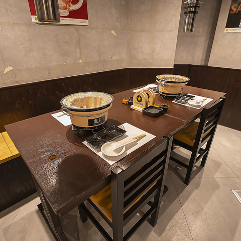 4名掛けテーブル席!炭火焼肉を囲みながら、ほどよい距離感で楽しめます♪落ち着いた空間で、食事も会話も自然と弾みます。ご友人同士の集まりや少人数の飲み会など、さまざまなシーンに使いやすいお席◎