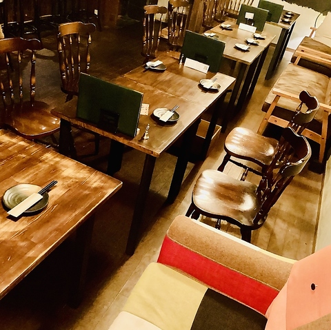木を基調とした内装と暖色系の照明がアットホームな雰囲気を演出しております。当店オススメのソファー席はリラックスしながら過ごすのに最適です◎ご友人との飲み会や女子会にご利用ください!