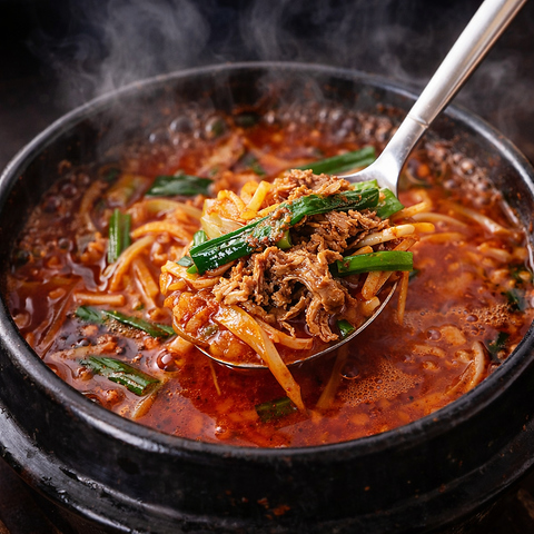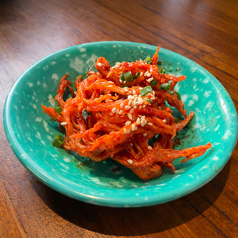 チュクミというのは日本語で「イイダコ」のこと。イイダコを甘辛いヤンニョムであえたイイダコ、そこに厚切り豚バラ肉を加えた「チュクミサムギョプサル」ぷりっぷりのイイダコと、豚肉の甘みが相まって海鮮とお肉のうまみを一度に味わえる贅沢な逸品です。