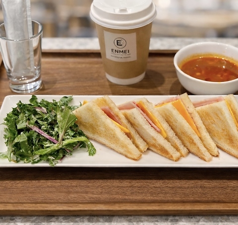 ENMEIでは朝7:30からモーニングを営業中。酵素ドレッシングサラダと酵素玄米エスプレッソラテ、ハムチーズサンドウィッチ、スープとスペシャルゼリーで日常の食事から自然に“腸活”を取り入れていただけます。