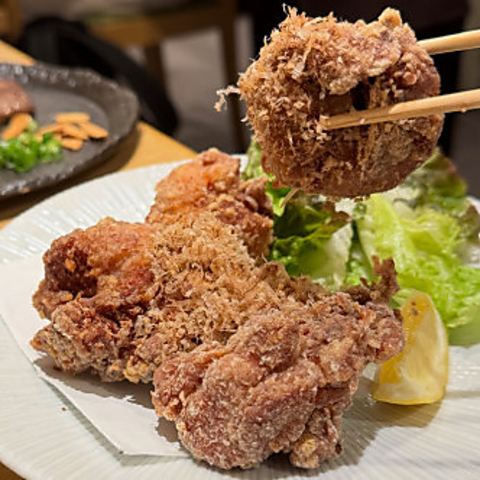 ~百福特製 鶏の唐揚げ~百福特製唐揚げは衣にかつお節を大量に混ぜ和風出汁薫る唐揚げになっており、あっさりジューシーに仕上がって、おすすめの鶏の唐揚げです。#ご飯#ランチ#ディナー#居酒屋#和食#魚#海鮮#日本酒♯ワイン#大阪#本町#飲み放題#接待#女子会#誕生日