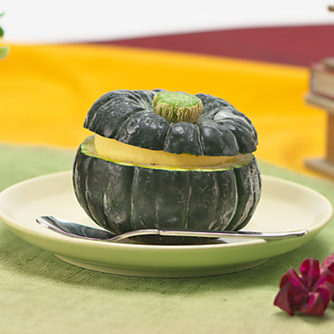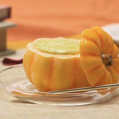 寒い時期におすすめ!小さなかぼちゃをくり抜いて器にしました。中には濃厚なかぼちゃのアイスクリームが詰まっています。アールグレイアイスティー付きです。