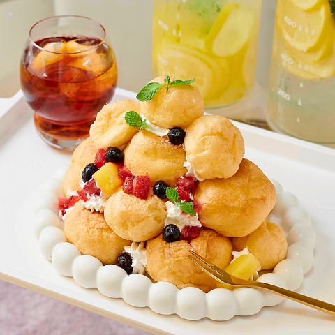 焼きたてのシューパフにやわらかバニラをたっぷり詰め込んだシューアイスと、薄皮仕立てのプチシュー皮にカスタードクリームとホイップクリームをブレンドした、甘さ控えめなシャルロットクリームを入れて食べやすい味に仕上げました。女子会の鉄板メニュー。アールグレイアイスティー付きです。