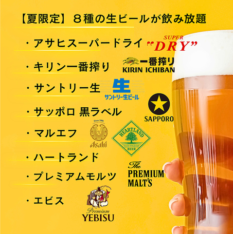 アサヒ・キリン・サッポロ・サントリー、国内4大メーカーの生ビールが飲み放題!それぞれの個性を飲み比べながら、料理とのペアリングも楽しめます。屋上の開放感とともに味わう一杯は格別。ビール好きにはたまらない至福の時間をどうぞ。梅田/大阪駅/駅ビル/BBQ/焼肉/貸切/歓送迎会/屋上/宴会/ビアガーデン