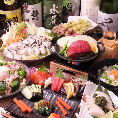 信州食材と厳選した旬の逸品を惜しみなく使用したコースは必見です!全て飲み放題込みのお値段です。既存のコース以外にもご予算やお好みに合わせたオリジナルコースも柔軟に対応しますのでお気軽にお問い合わせ下さい♪10名さまから完全個室でのご案内も可能です。※写真はイメージです。