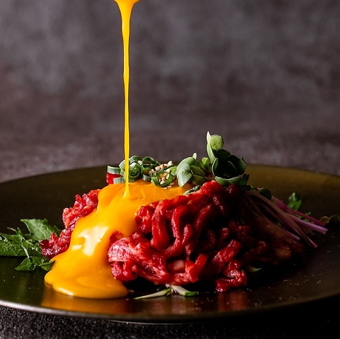 贅沢な和牛の旨みを生で堪能。濃厚卵黄が味を深め、至福の余韻を残します。