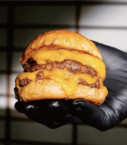 国産牛100%パティから溢れ出る肉汁をカットした断面に吸わせ、その断面を二度焼きすることでカリッとした食感と肉汁の旨みを一層引き立てた極上の一品【材料:パティ/チェダーチーズ/煮たまねぎ/ピリ辛ソース】