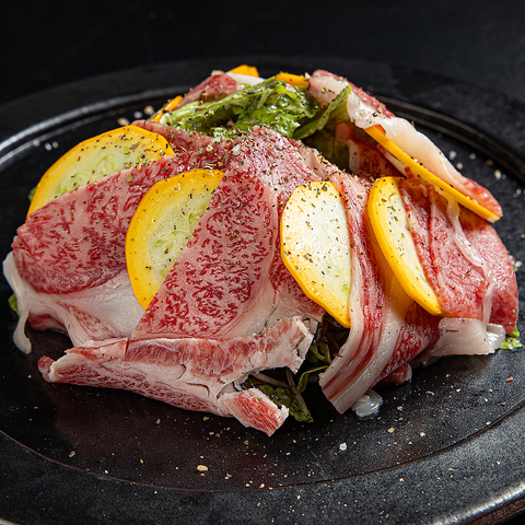 【黒毛和牛サーロインのタタキ】は、口に含んだ途端に溶けるような味わいが絶品!自家製ポン酢と酒蔵から仕入れた醤油で作るソースが、サーロインの旨味をより一層引き立てます。同じく一押しの【黒毛和牛カルパッチョ】は、イタリアで使われる上質な塩などを配合した特製塩と、厳選したオリーブオイルをかけて仕上げる贅沢な逸品です。