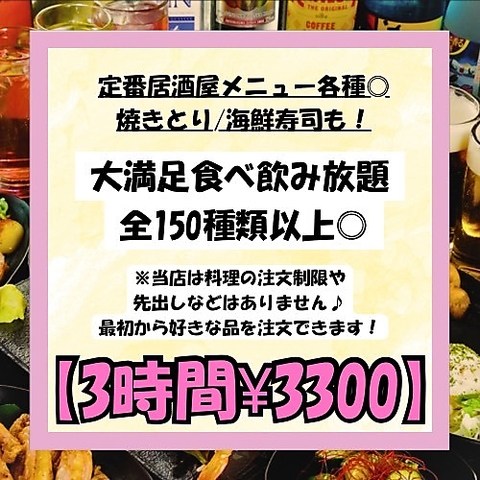 ≪どれだけ食べても飲んでも3時間3300円≫追加料金一切なし♪曜日・時間帯関係なくいつでもご利用OK!!