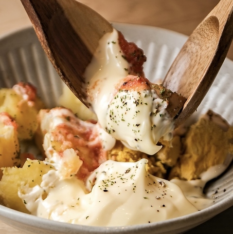 初雪名物のポテトサラダは出汁をたっぷりと染み込ませた自慢の看板メニュー 手元に届いたらスプーンでよく混ぜてお召し上がりください。