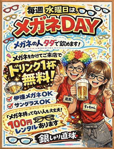 なんとメガネをかければドリンク1杯無料というおもしろ企画!水曜日はみんなでメガネかけちゃおう♪