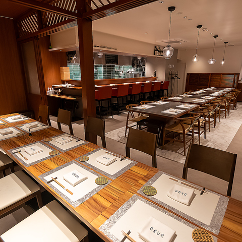 落ち着いた雰囲気の中でお食事を楽しめる広々とした席をご用意しております。カウンター席では、シェフの技を間近で感じながらお楽しみいただけます。また、テーブル席はグループでの利用にも最適で、気軽におしゃべりを楽しむことができます。貸切も可能ですので、特別なイベントやパーティーの際はぜひご相談ください。
