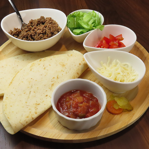 牛ひき肉、カットトマト、チーズなど数種類の具材を自分で巻いてお好みのタコスをお楽しみください。特にディナータイムではワインなどお酒のおつまみとしてもグッド!