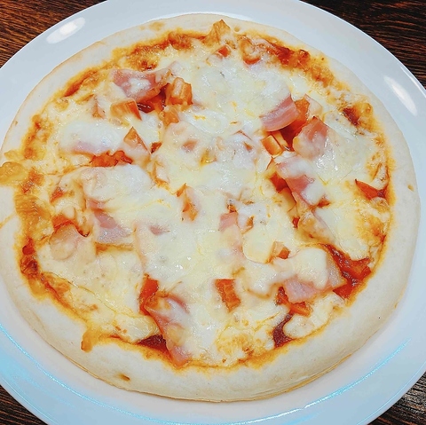 モチモチ触感の生地にたっぷりのトマト、ベーコン、チーズをのせた定番のピザ。お食事やシェアしておつまみとしてもgood!