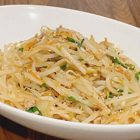 ニラやもやしをピリ辛のひき肉と一緒に炒めています。辛いのについつい箸が伸びてしまうおいしさ。