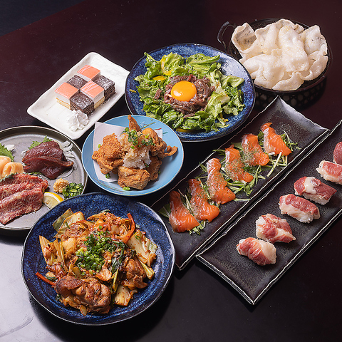 馬刺し盛り合わせに馬刺しユッケサラダ、馬刺し寿司と馬尽くしのコースです♪生ビール付きのリッチ飲み放題付き♪