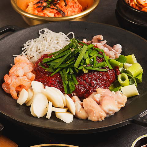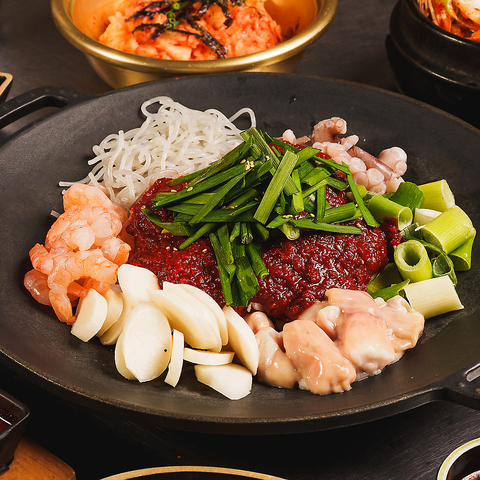 プサンの名物ナッコプセです。ナクチ(タコ)、コプチャン(ホルモン)、セウ(エビ)と特製タレや色んな具材を加えてご飯にかけると最高に美味しい!ピリ辛でも大人気なので是非お召し上がりください!