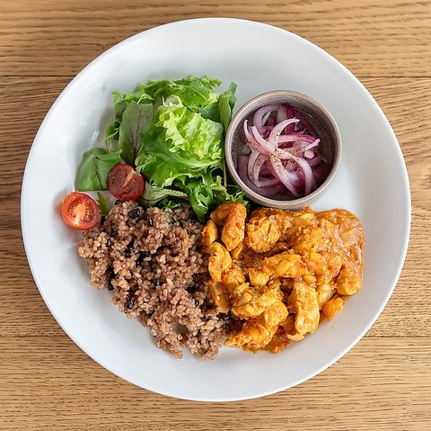 こころキッチンカフェの人気No.1メニュー。薬膳の考え方をベースに、春キャベツ・新じゃが・春菊などの旬野菜を中心に使用しています。もちもちの酵素玄米おむすびに、選べるメインと春野菜と発酵調味料をふんだんに使ったお惣菜を楽しめる特別プレートです。※食材の仕入れ状況によって惣菜の内容は変わります。