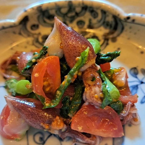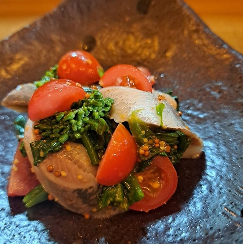 豊洲から仕入れる厳選素材を使用した一品料理の数々。丁寧に仕立てた盛り付けは目にも美しく、一品一品の風味を引き立てます。彩り豊かな創作料理、海鮮料理をぜひご賞味ください。仕入れによりメニューが入れ替わりますので、何度来店しても飽きずにお愉しみいただけます。お立ち寄りの際はお気軽にご来店ください。