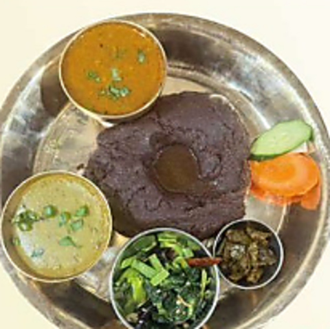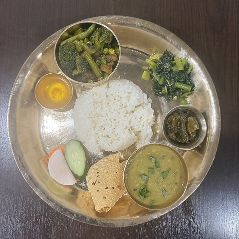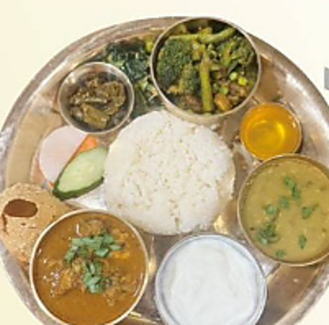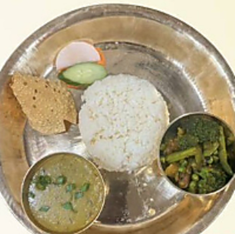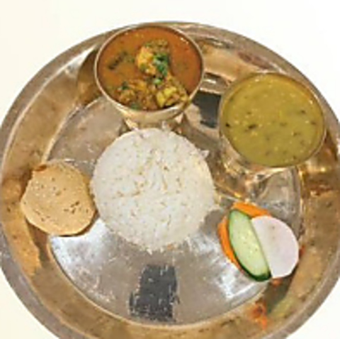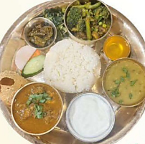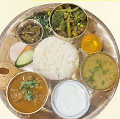 ネパールの家庭で日常的に食べられている一皿完結型の定食です◎豆カレーやチキン/野菜/マトンの選べるカレー、漬物、お惣菜など8種類がワンプレートに!ヘルシーでありながらボリューム満点です。平均価格帯は1290円前後で、ネパールの食文化を味わえる当店イチオシの料理です♪ぜひお試しください。