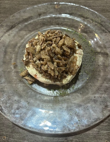 ポテトサラダにフライドオニオンとアンチョビガーリックをあえて上に乗せました、癖になる味です。