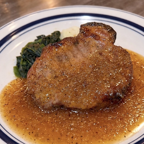 低温で長時間加熱したポーク肩ロースステーキは柔らかいです。野菜の甘みを感じるシャリアピンソースと付け合わせのマッシュポテトとほうれん草とご一緒にお召し上がりください。