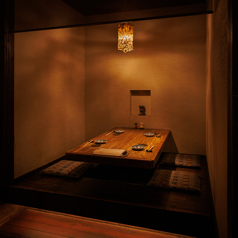 和モダンで落ち着きと温かみに溢れた店内は半個室とカウンター席のご用意。職人の精緻な仕事ぶりを間近で楽しめるカウンター席では職人との会話を愉しめ、また都会の喧騒を離れて過ごす静かな半個室席では美食にとことん向き合える席となっております。お客様が肩ひじ張らずにお寛ぎいただけます。ごゆっくり博多の夜をお過ごしくださいませ。