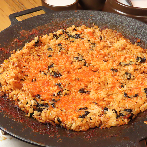 新鮮なイイダコ(チュクミ)の旨辛鍋。13種の調味料を混ぜ合わせた旨味たっぷりのコチュジャンダレがコク深いやみつきの辛さ。ぷりぷり歯ごたえのチュクミはお酒が進みます。〆には必ず食べたいとびっこチャーハンは、旨辛ダレで炒めたごはんにたっぷりの韓国海苔ととびっこを。プチプチ食感がほかでは味わえないおいしさ。