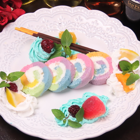 食後のデザートは別腹!当店のレインボーロールケーキは、見た目もキュートな大人気メニューです♪カラフルな層が目を引く、まさに「映え」デザートの決定版!もちろん、見た目だけでなく、優しい甘さで食後の口をさっぱりとさせてくれます。他にも種類豊富なデザートをご用意しておりますので、ぜひお楽しみくださいませ。
