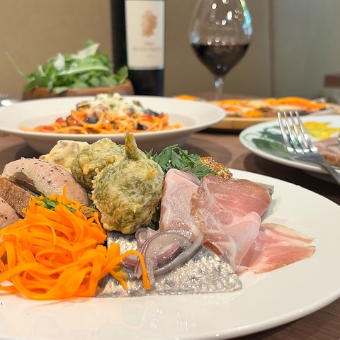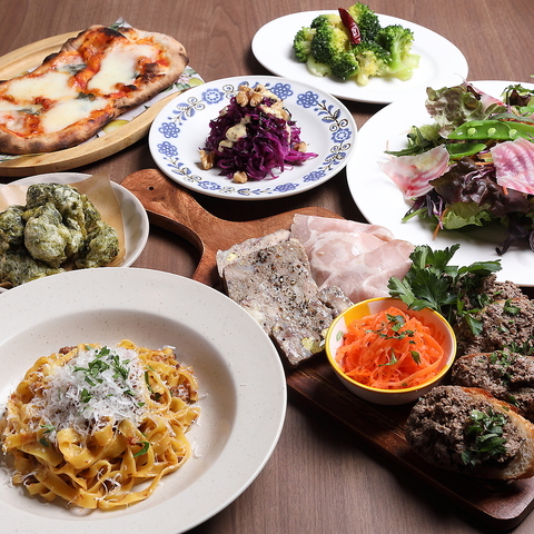 白レバームースや鮮魚のカルパッチョなど手作り前菜7種盛り合わせに、ローマ発祥のピッツァ「ピンサ・ロマーナ」、本日のパスタがメインのカジュアルコース!ビールや自慢の辛口イタリア産スパークリングワインも楽しめる2時間の飲み放題付きです◎ちょっとしたお食事はもちろん、各種ご宴会にもバッチリおすすめ♪