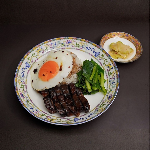 香ばしく艶よく焼き上げた叉焼に、目玉焼きを添えて。ライスには風味豊かな味付きジャスミンライスを使用しています。