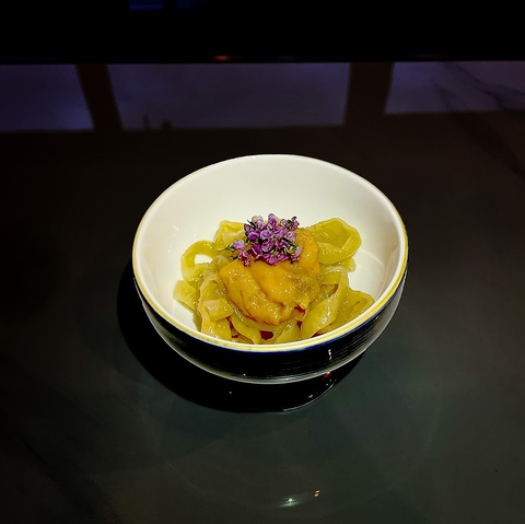 新鮮な帆立をさっと蒸し、九条ネギに熱い油をかけて香りを引き出しました。仕上げに特製の醤油をかけた、シンプルながら風味豊かな一品です。