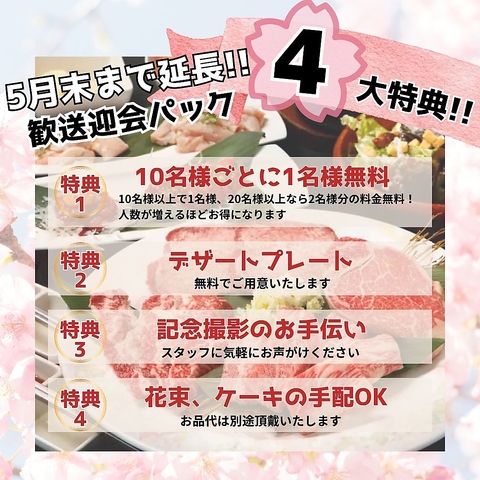 歓送迎会に最適な4大特典パックをご用意。ご予約時にお電話かネット予約備考欄にてご連絡ください。