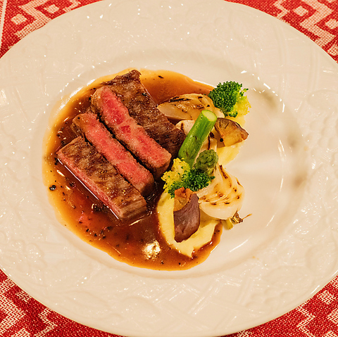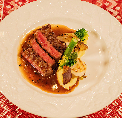 繊細な火入れで引き出したA4黒毛和牛の極上の旨みを、トリュフの優雅な香りが包み込みワインと共に味わうことで、一口ごとに深い余韻をもたらします。